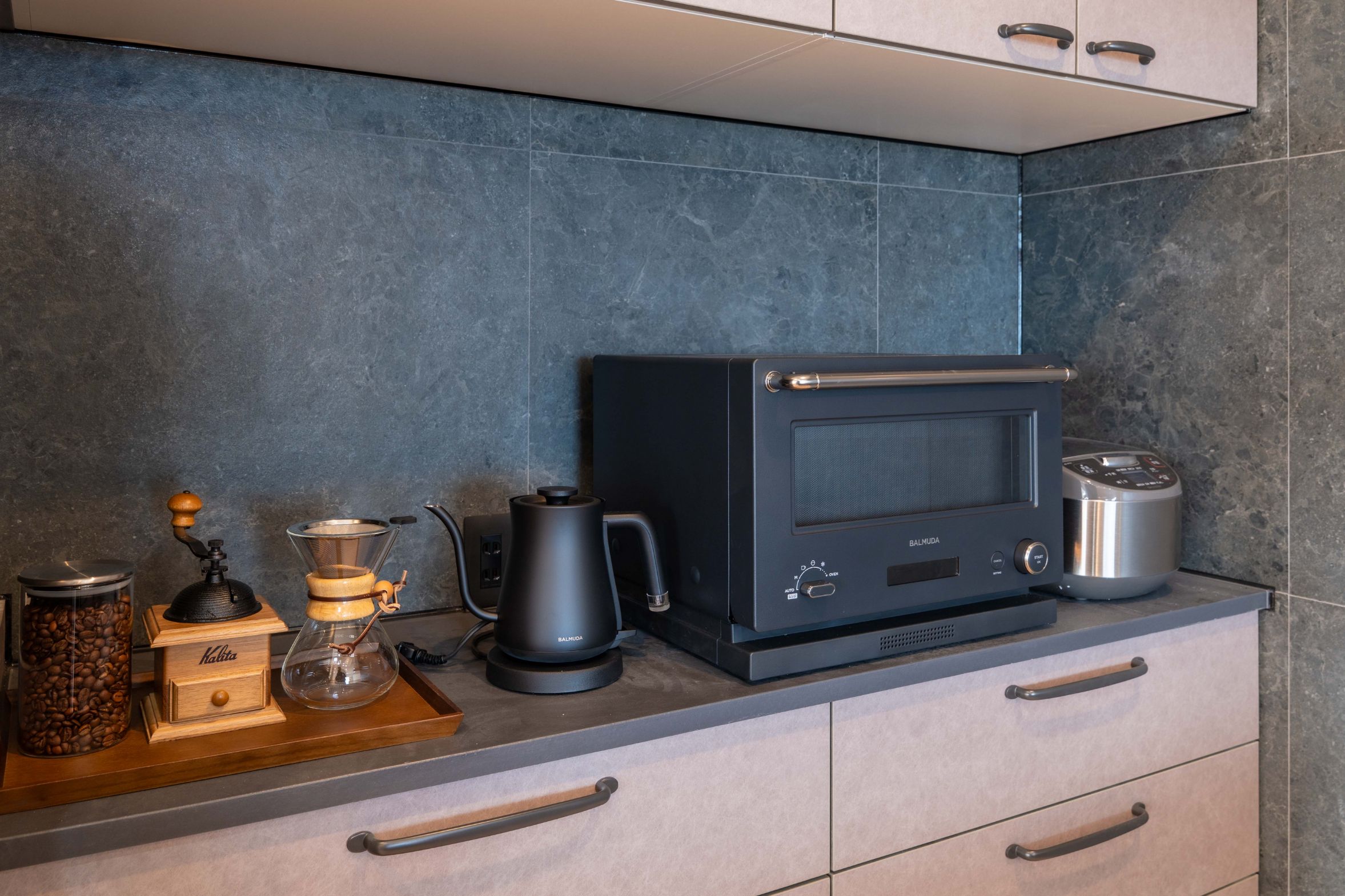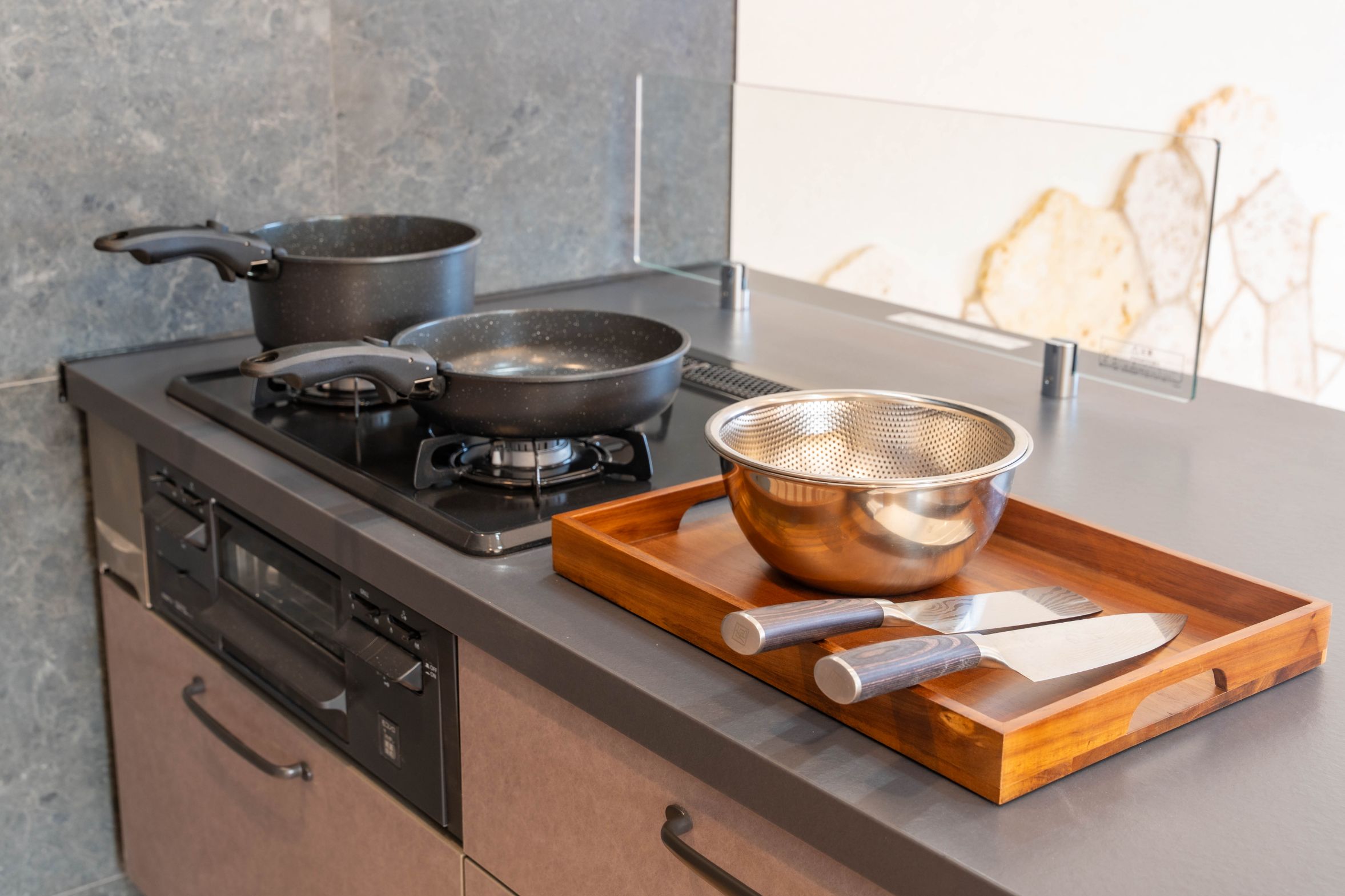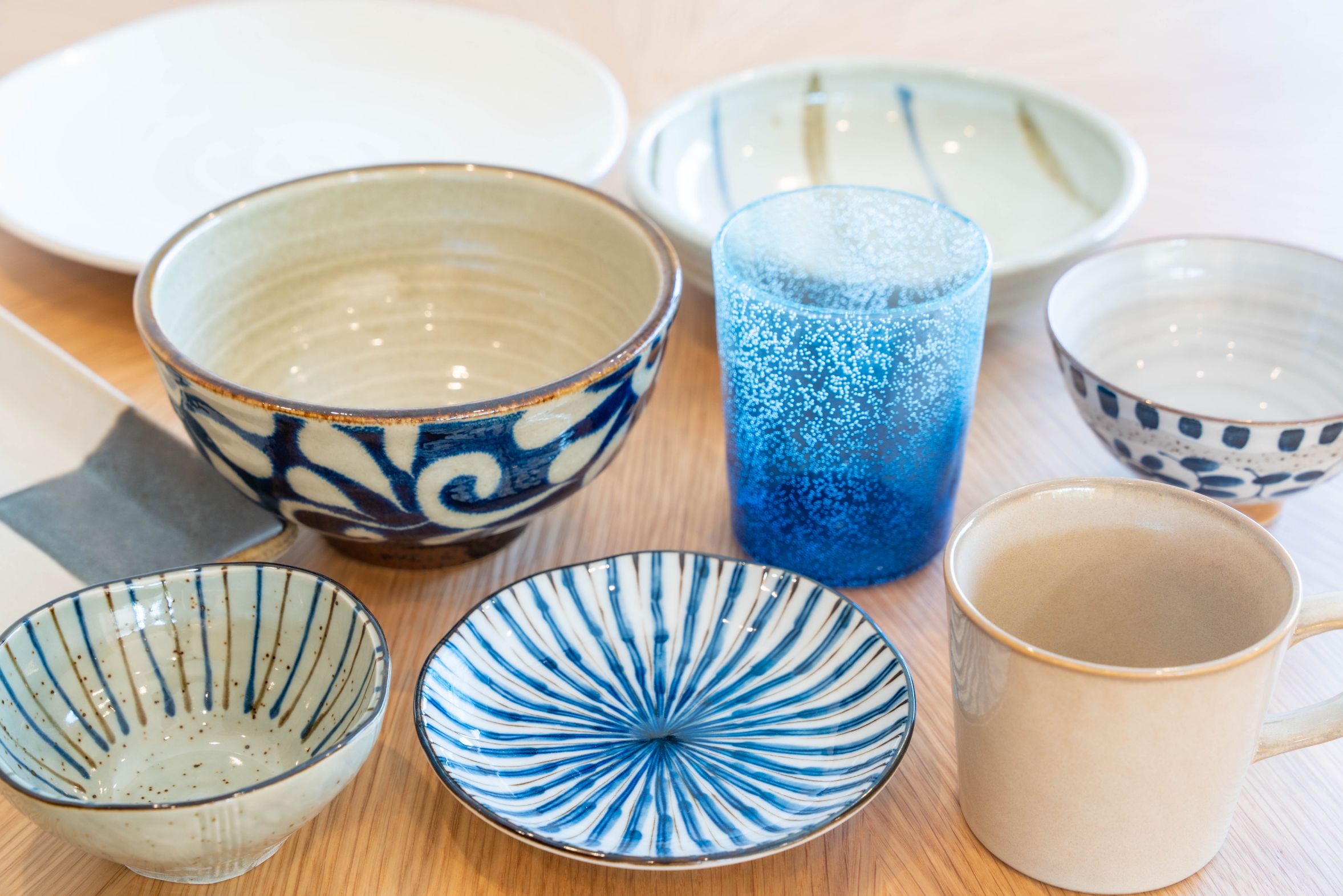 キッチンに、お皿やコップなどの鍋各種、食器類、包丁、まな板、おたま、菜箸、ピーラーなど基本的な調理器具を常設しております。